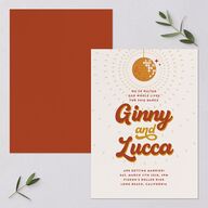 Playful and undeniably groovy, these retro wedding invitations set the stage for your upcoming bash. A hand-drawn disco ball descends from the top of the page, highlighting your names, which form the centerpiece of the design rendered in nostalgic script. Your custom message and wedding details are outlined in minimalist sans-serif typography.