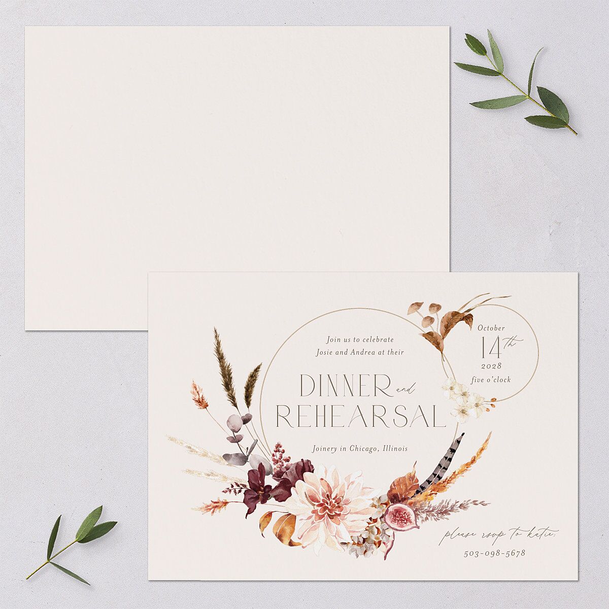 Start the festivities in style. Bohemian floral hoops adorn the front of these rehearsal dinner invitations, delicately displaying an eclectic array of fonts and important details like your names as well as the venue, date, time, and contact details.