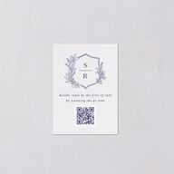 These mini RSVP cards make responding feel effortless and elegant. A leafy crest frames your monogram above a scannable QR code, blending classic and modern aesthetics. On the reverse, a simple note directs guests to your wedding website, ensuring all the details are just a quick scan and click away.