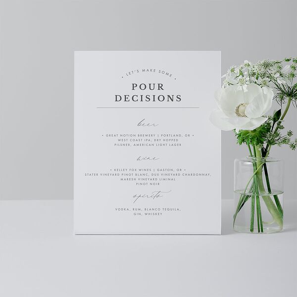 Infuse your celebrations with an organic undertone using these bendy signs. Set against a crisp backdrop, a list of "pour decisions" is presented in modern uppercase lettering, accented with calligraphy, inviting your guests to indulge in the treats ahead of them.