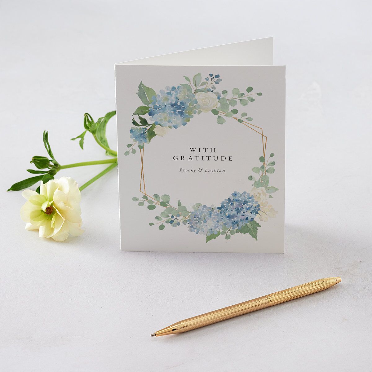 A faux metallic frame decorated with watercolor hydrangeas, roses, and greenery is showcased on this thank-you card. The words "With Gratitude" and your names appear in elegant typography at the center of the design.