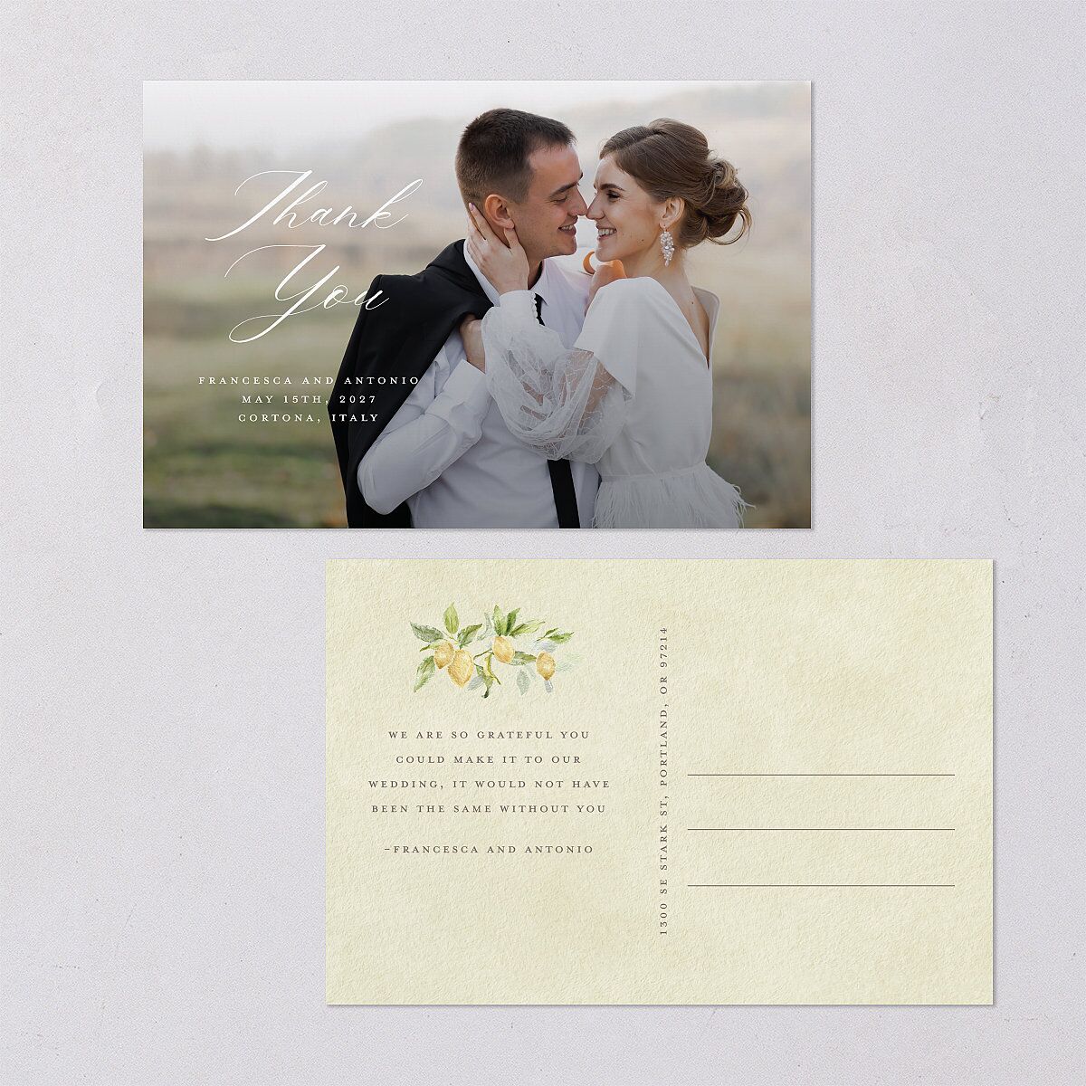 The front of these thank you postcards shows your chosen photograph as the backdrop, along with the words "thank you" and details of your wedding. The back shows a watercolor illustration of lemon branches, your message and space for a mailing address, all on a textured backdrop.