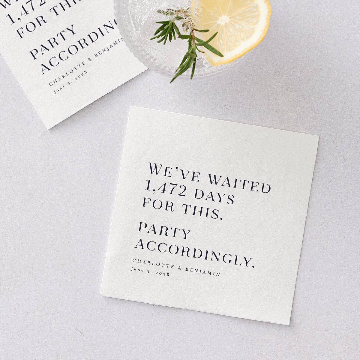 Fun and festive, these wedding cocktail napkins set the stage for a celebration to remember. Each one features a spirited message in a classic serif font, sure to bring a smile to your loved ones' faces as they place their drinks down and head to the dance floor.
