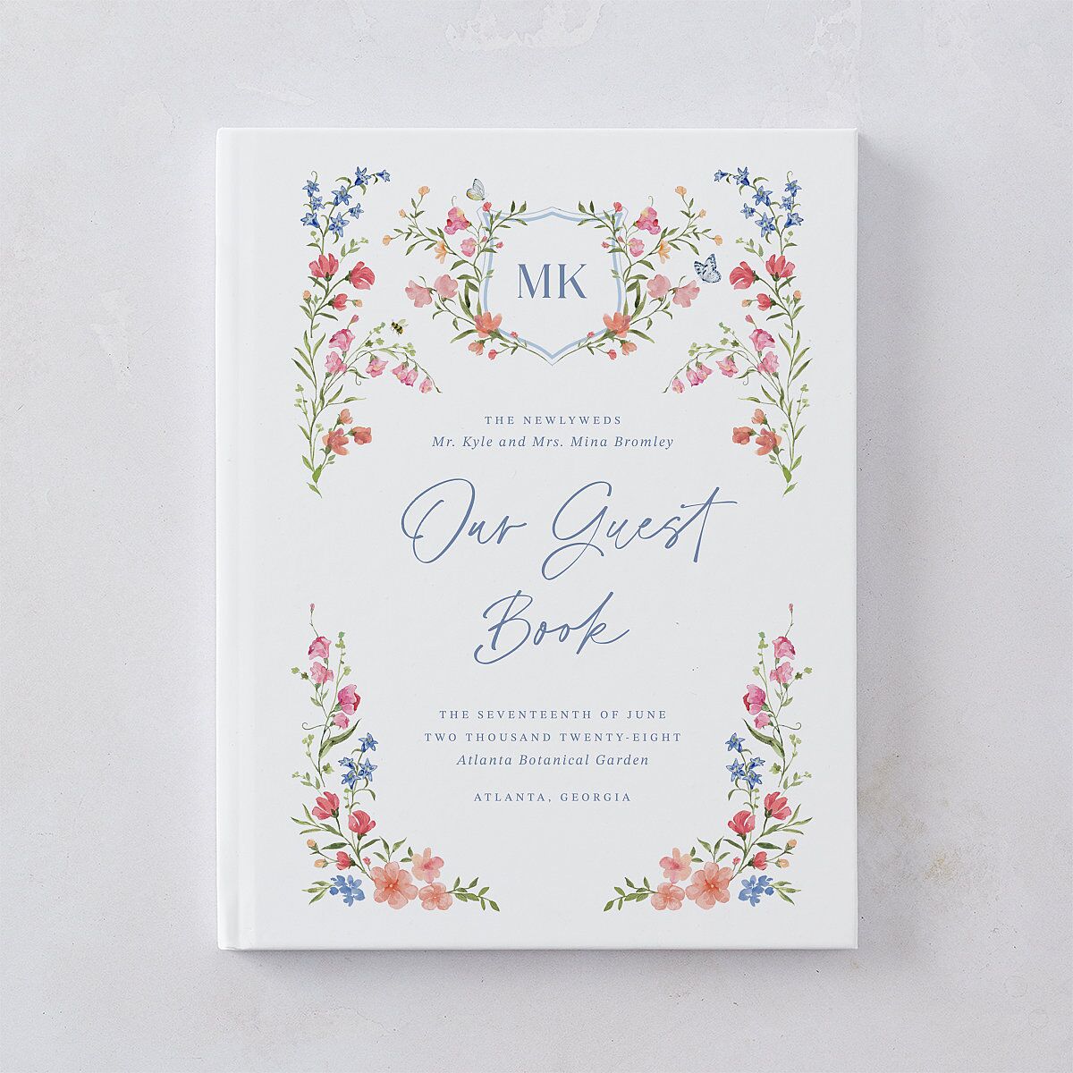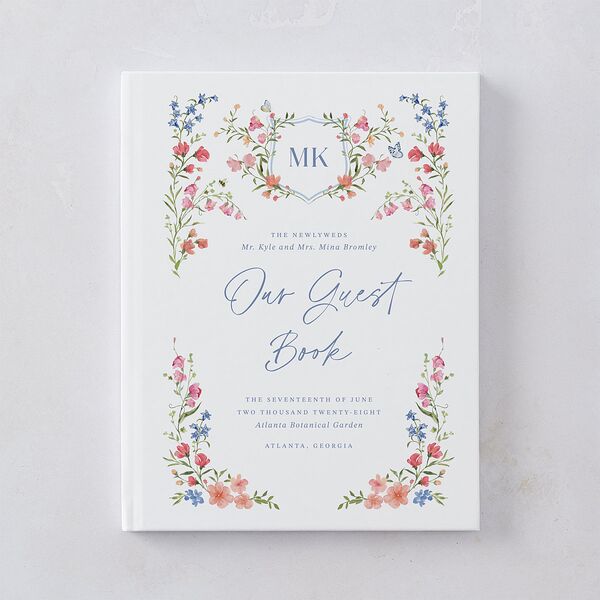 A garden of painted blooms graces the cover of these wedding guest books, inviting loved ones to pen their wishes within. Each hand-drawn wildflower and typographic detail evokes the beauty of a storybook romance, designed to hold the words that make your day unforgettable.