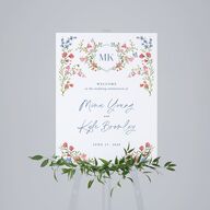 Like a garden plucked from a fairytale, these welcome signs display your names in flowing cursive script beneath a floral-clad topper. A monogram crest blooms with watercolor wildflowers in gentle shades of nature, setting the stage for your celebration.