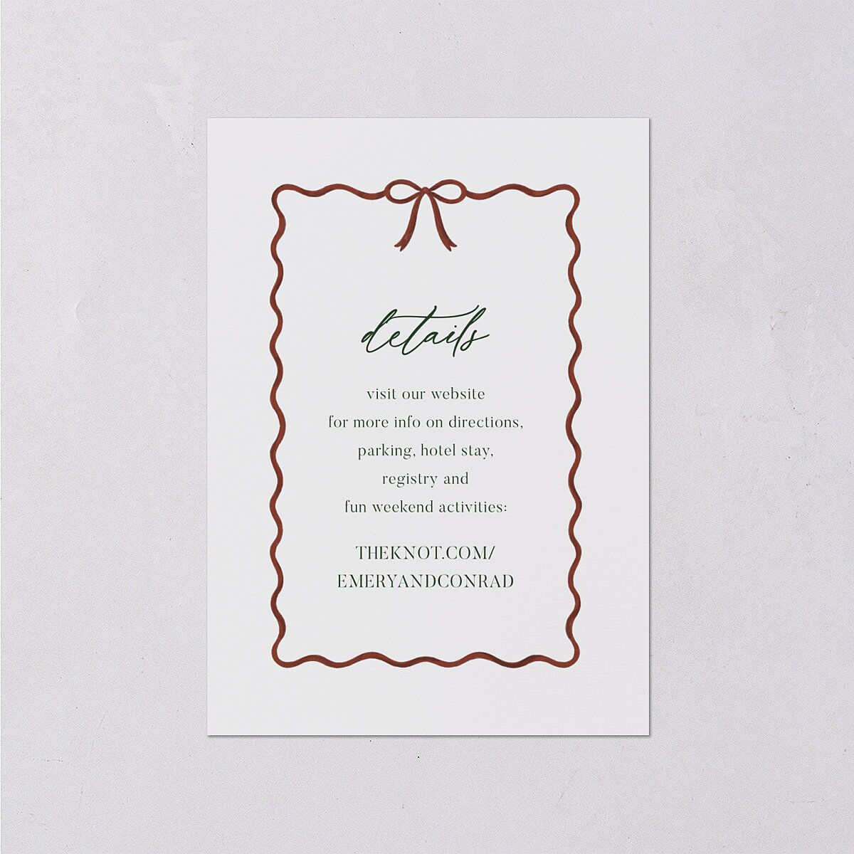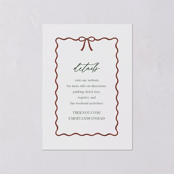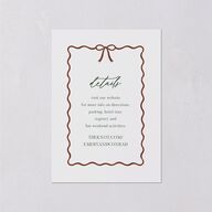 These wedding enclosure cards showcase your event details beneath an elegant script heading in a festive ribbon frame. The back features a valid QR code against a simple solid-color backdrop, directing your guests to your website or social media page for further information.