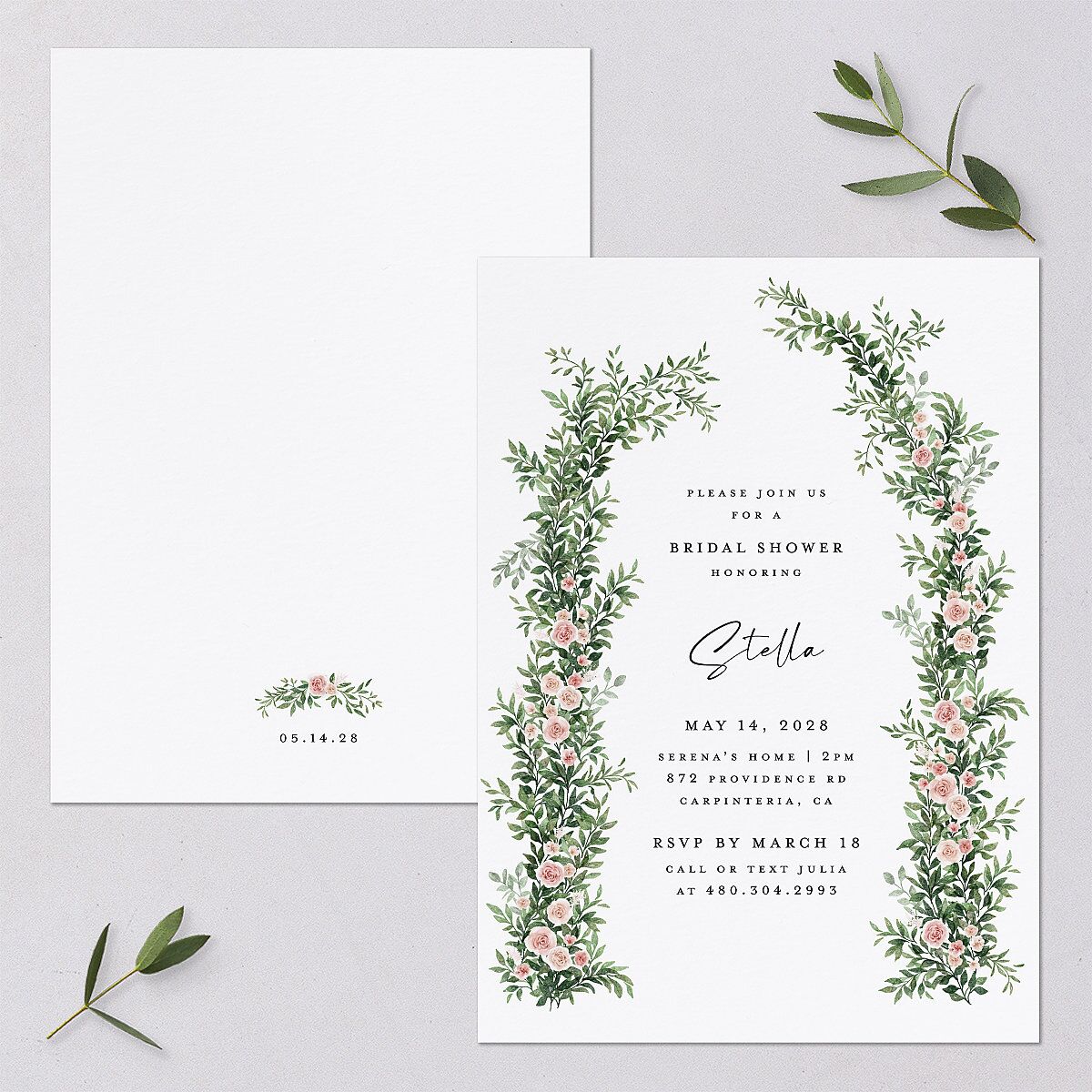 Your details appear on these bridal shower invitations in elegant script and serif font. This information is framed by an climbing arc of floral illustrations, complete with adorable pink roses.