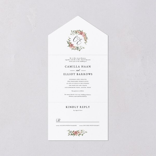Send your wedding invite out with some floral flair. On this all-in-one, a flower wreath circles your initials to make a monogram.