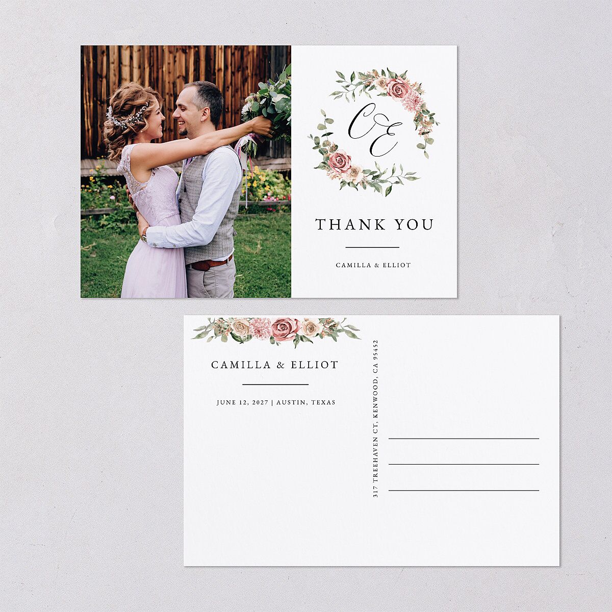 Customize your thank-you postcards with a photo of your choice, set next to your illustrated wedding monogram complete with a floral motif. Your details appear in serif font and there is space to write your recipient’s address on the back of the card.