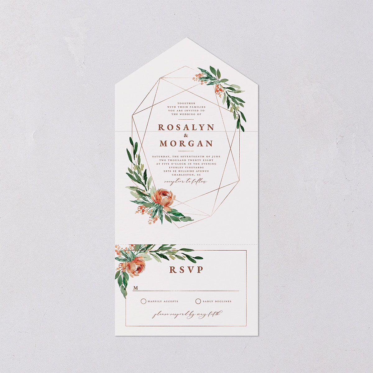 With its blend of script and serif fonts, this all-in-one invitation lets you add some gilded luxury to your day. Your names and the details of your wedding sit at the heart of a geometric frame, which is given a romantic twist with watercolor depictions of peonies and greenery. The bottom of this invite offers space for your loved ones to respond, alongside a simple frame and floral motif.