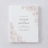 Invite your guests to pen their warm wishes in your wedding guest book, featuring your names and event details in a frame of intricate florals.