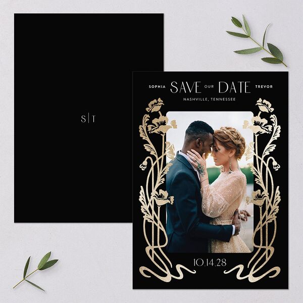 Embrace your joyous chapter with a regal design, foil border, and art nouveau fonts on your save-the-date card. Each card displays an elegant portrait of you and your loved one alongside your names, location, and date.