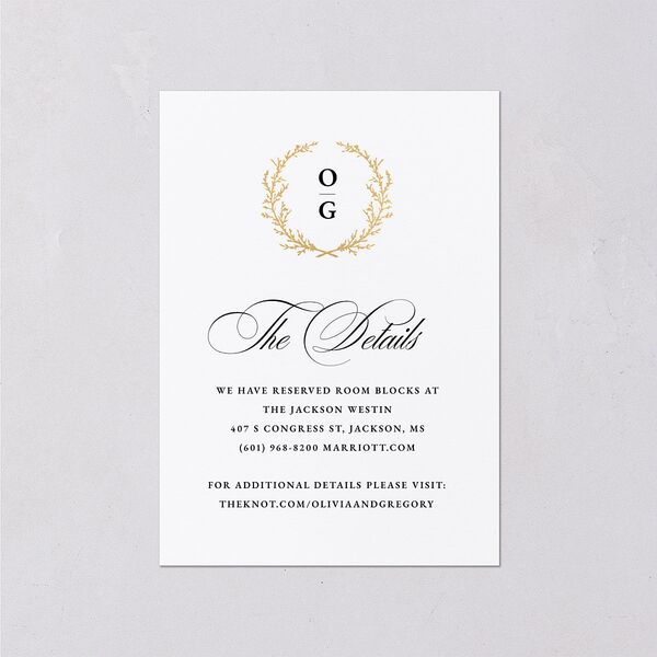 Your wedding enclosure cards add a dash of opulence with a gilded wreath that shimmers with rich gold foil. The important details are listed in a mix of refined fonts, and on the reverse, there is a convenient QR code for guests to find more information.