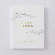 This keepsake guest book features a graceful illustration of botanical elements on the cover. They frame a serif font that reads ?guest book?, with your details set in similar type underneath. The inner pages are blank for customization.This book has a casebound cover with matte lamination, and 100 blank pages (50 sheets) of 70# opaque text paper. Includes a 0.25" white grosgrain bookmark ribbon.