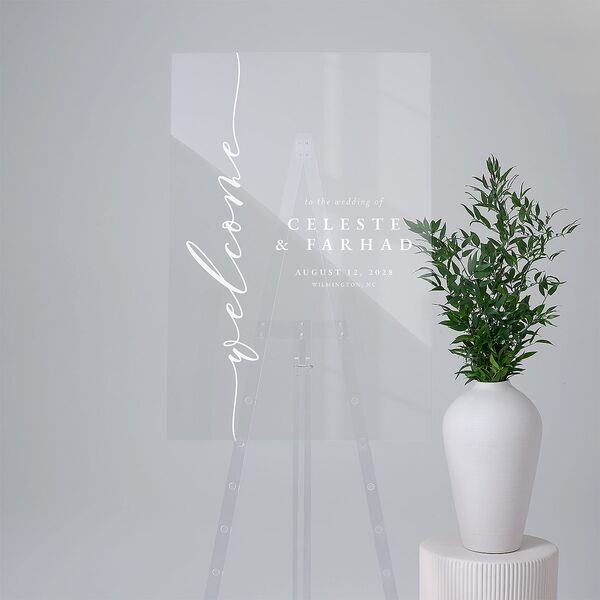 A graceful script spills down the left edge of these welcome signs, warmly greeting guests in a style that feels modern and timeless. Your names are set in refined serif caps, balanced by understated details including wedding date and event location. With its vertical flow and subtle elegance, this sign sets the tone for a celebration that’s polished, personal and effortlessly inviting.