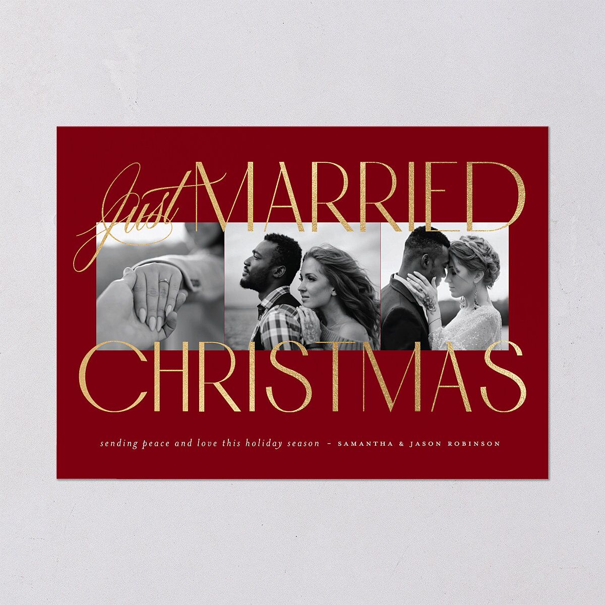 You're sending your first Christmas card as a married couple, a one-of-a-kind joy. Your chosen color scheme shows contrasting background colors for the front and back of your card. The front also includes a series of three photographs. These are surrounded by the words "Just Married Christmas," written with shining foil in a mixture of script and print. The card's back shows your message and the year in print with your names printed in calligraphy-style script.