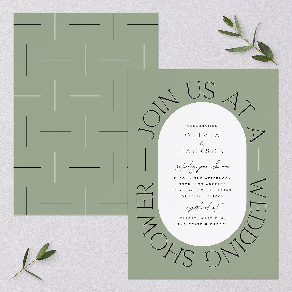 At the center of this distinctive bridal shower invitation, your names and event details are laid out in elegant fonts within an oval shape. Bold, arched typography surrounds your names and event information, while a pattern of geometric lines decorates the back of the design.