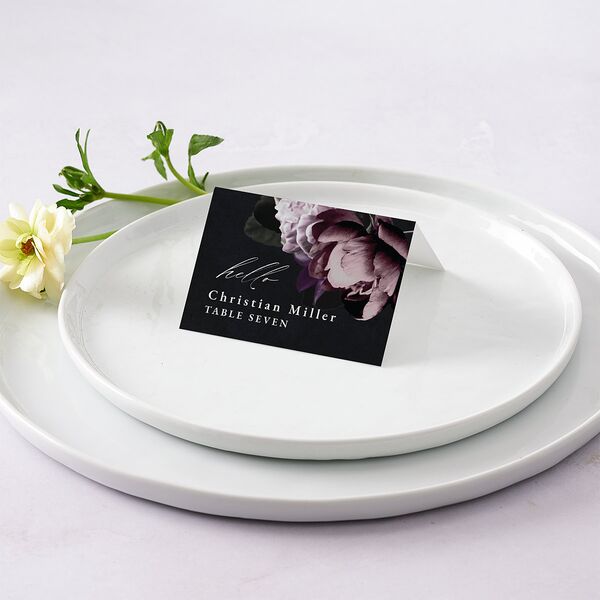 A rich flourish of florals features on these place cards, set next to your guests’ details. This information appears in a combination of calligraphy and serif font.