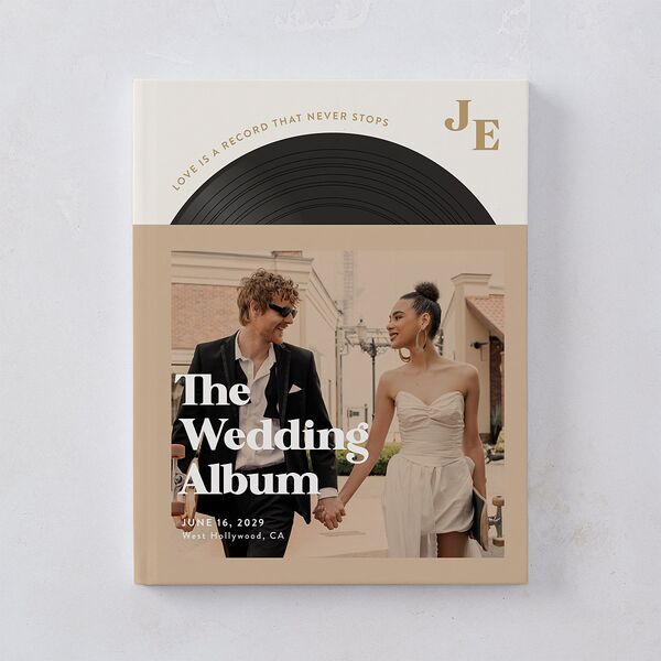These wedding guest books let your loved ones leave heartfelt messages within the covers. A photo of you and your partner, overlaid with a retro filter and groovy typography, evokes a classic vinyl sleeve. A vinyl record pops out at the top, accented with an arched slogan and your personal monogram.