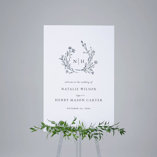 Set the tone for your wedding with a welcome sign blossoming with bohemian charm. Decorative wildflowers gently unfurl around your personal monogram, creating a soft, romantic frame. Below, your names appear in classic serif typography, paired with a heartfelt welcome message in italics.