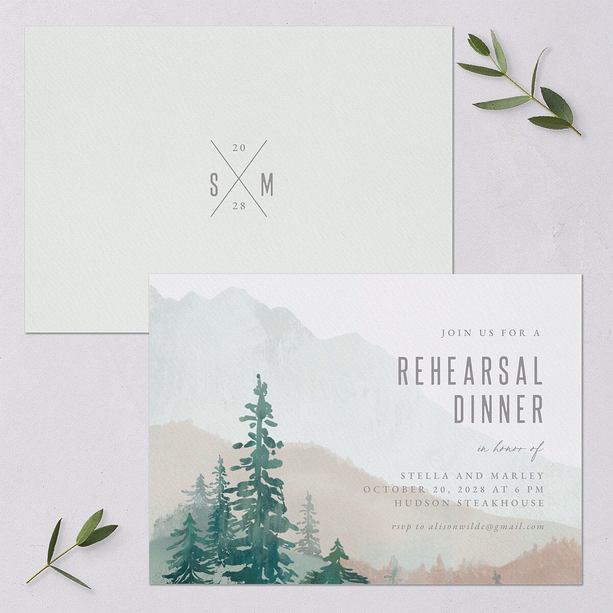 This rustic rehearsal dinner invitation features a painted mountain scene in the background and the details of your pre-wedding party outlined in a mix of simple and serif fonts. On the back, your monogram and wedding date appear against a visually textured background.