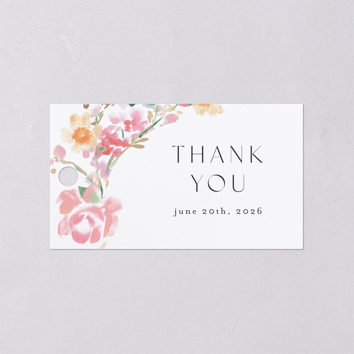 Watercolor florals and foil petals decorate the front of your favor gift tags, arching over the words "thank you" and your wedding date. Your custom thank you message appears on the back, adding a personalized finish to your luxurious event.