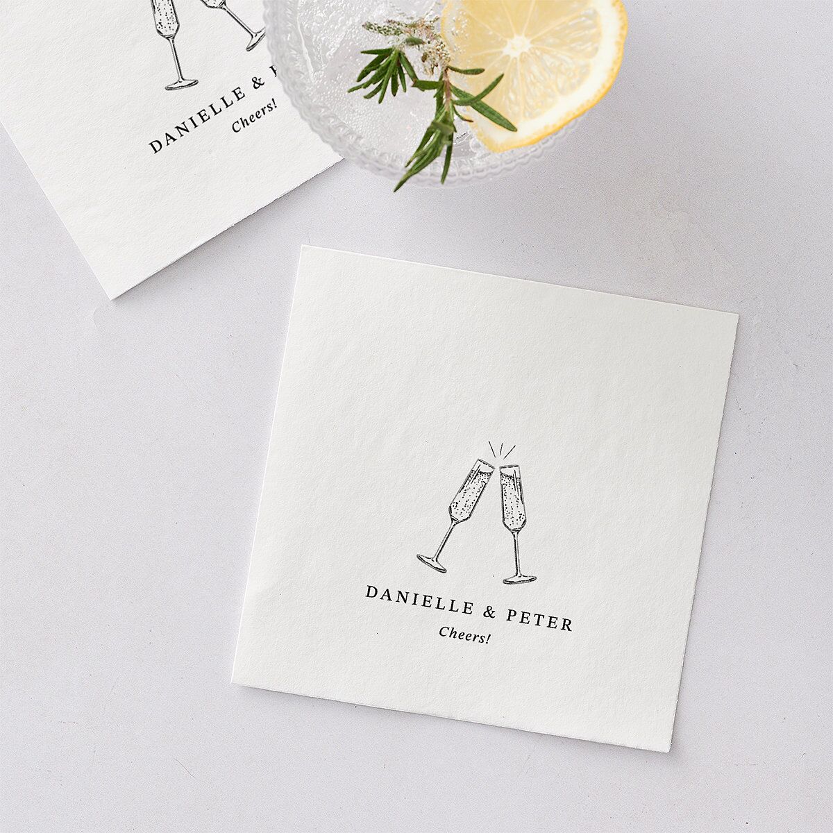 There’ll be plenty of toast-raising involved with these celebratory-themed cocktail napkins. Two simple champagne glass illustrations clink together with emotive flourishes rising from where their edges touch. Your names and a customary “cheers!” appear below in an elegant serif font.