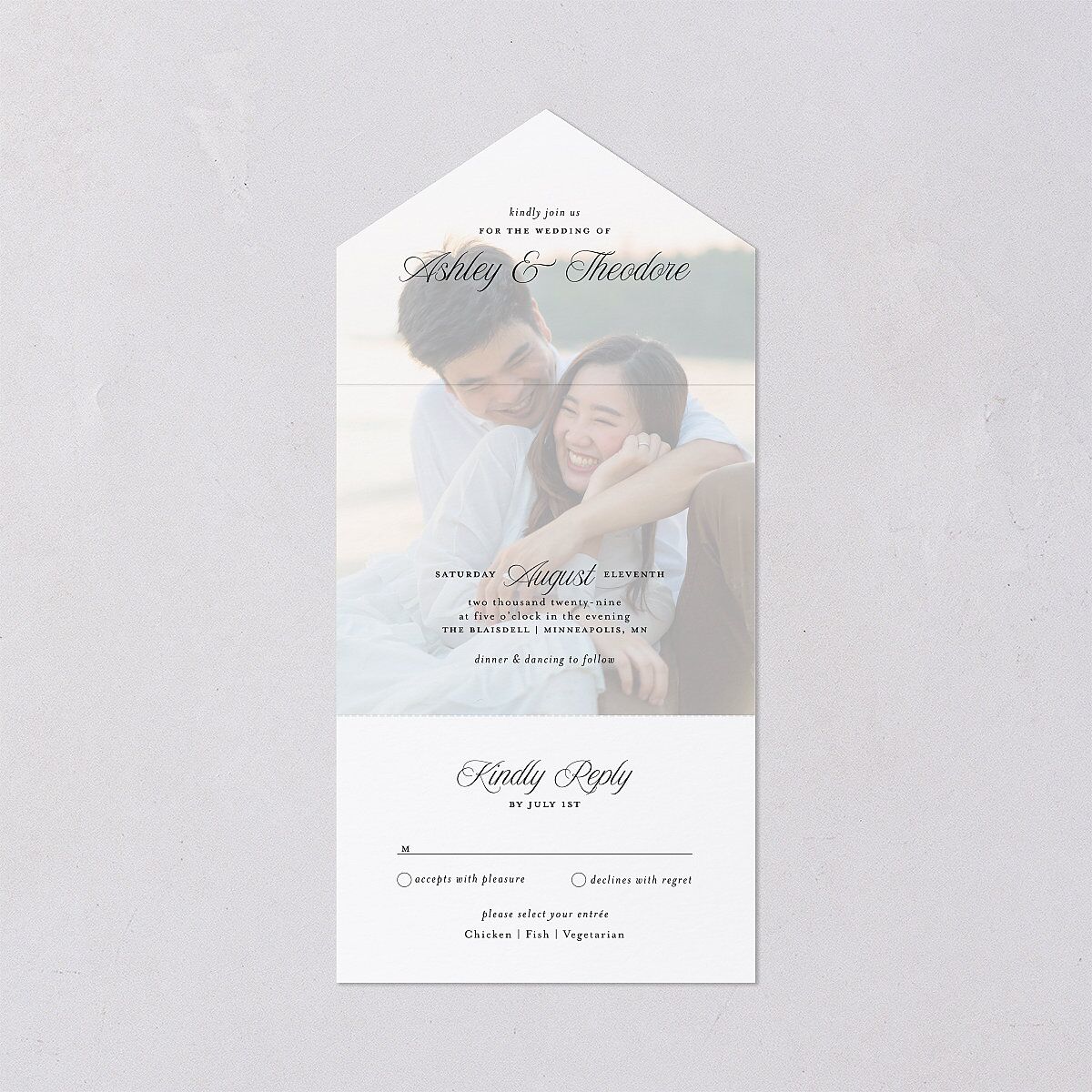 Mix and match your traditional invitation and response card into one seamless design. These all-in-one invitations feature an image of you overlaying the invitation part, with an attached response card in calligraphy and serif typography. Those same dual fonts play out across the reverse, which features your loved ones' addresses.