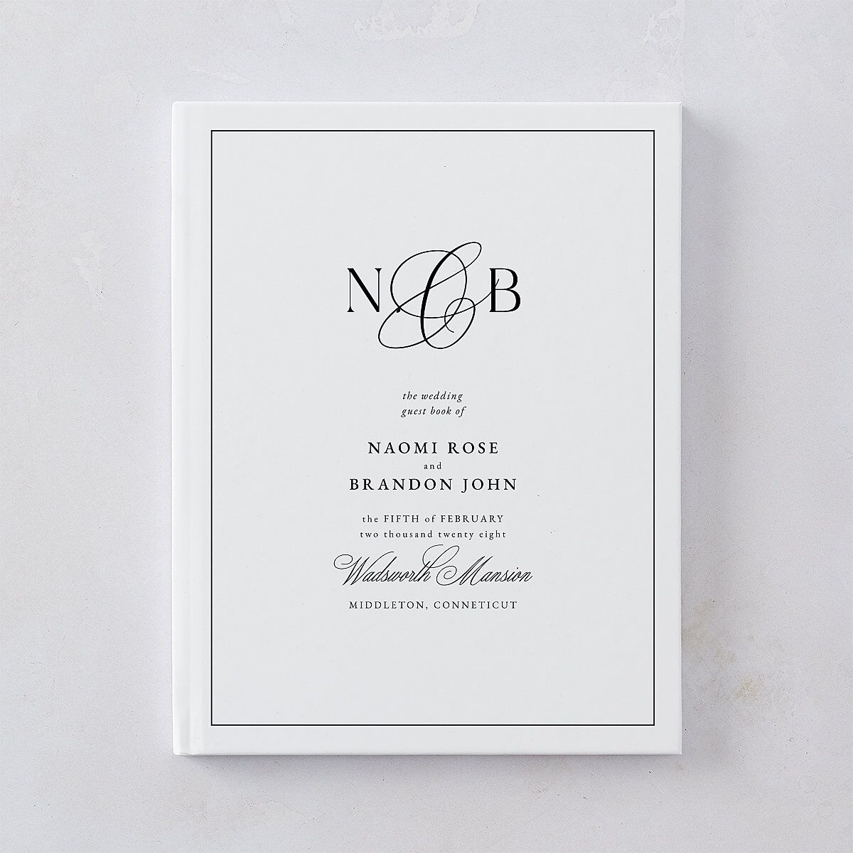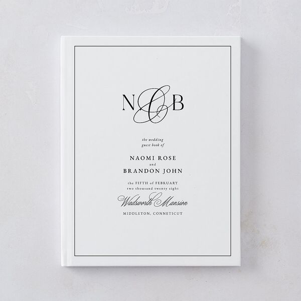 Your wedding guest book features a blend of elegant serif fonts and calligraphy that display your initials with the date and location of your wedding event beneath. A sleek border completes the design.