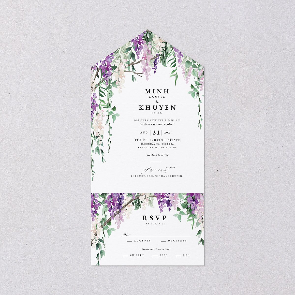 Experience timeless romance with these ornate all-in-one wedding invitations adorned by a graceful hanging wisteria design.