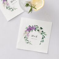 These beautiful floral cocktail napkins are a perfect blend of charm and nature. A crown of cascading Wisteria florals encircles your custom monogram boldly set in a classic serif font with your italicized wedding date below.