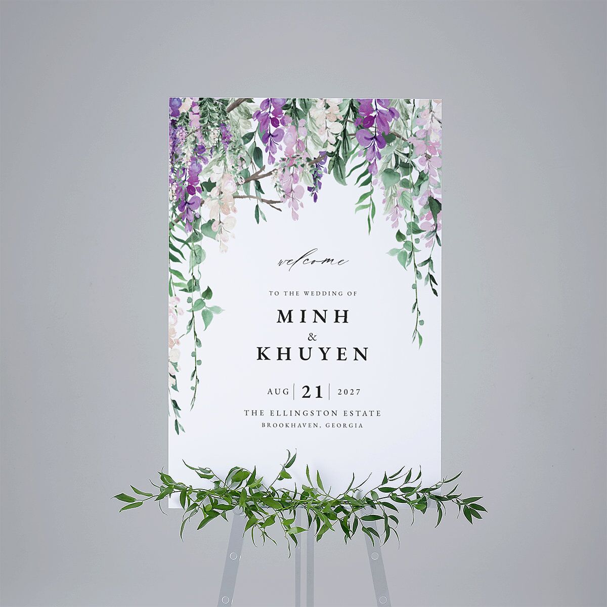 A cascading wisteria branch crowns this beautifully ornate welcome sign. Below, your names are boldly presented, with a welcome message in a clear, soft, flowing script for a romantic vibe. The addition of your celebration date adds a touch of personalization.