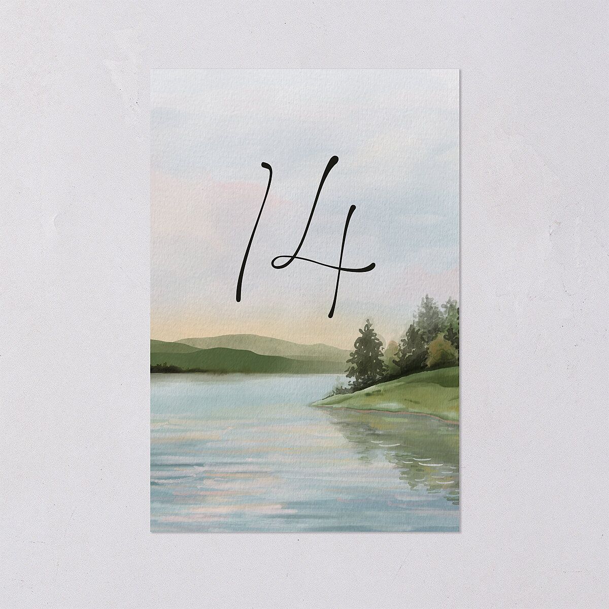 An artwork depicting a watercolor horizon is featured in the background of this rustic table number. At the center of the design, the number is displayed in a bold and distinctive font.