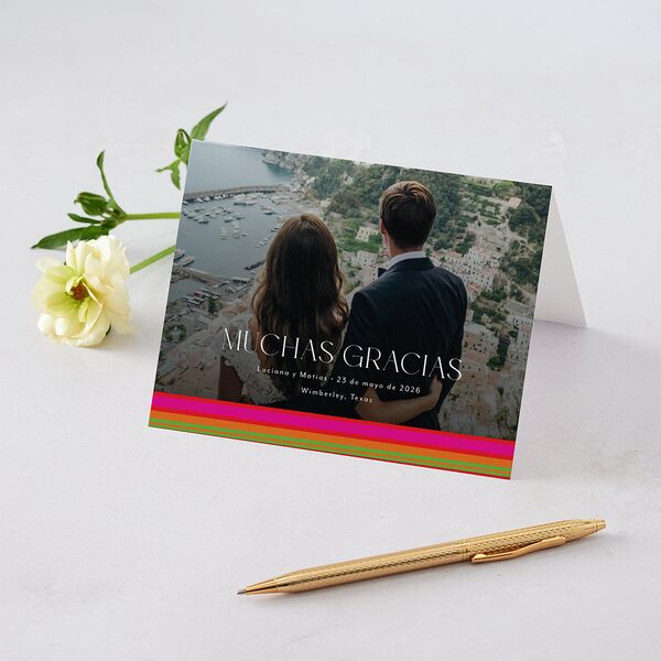 After your happy day, words of thanks. The front of your thank you card shows your selected photo as a background for the words "Muchas Gracias," your names, and your wedding details. Lines of color and foil fill the bottom of this card.