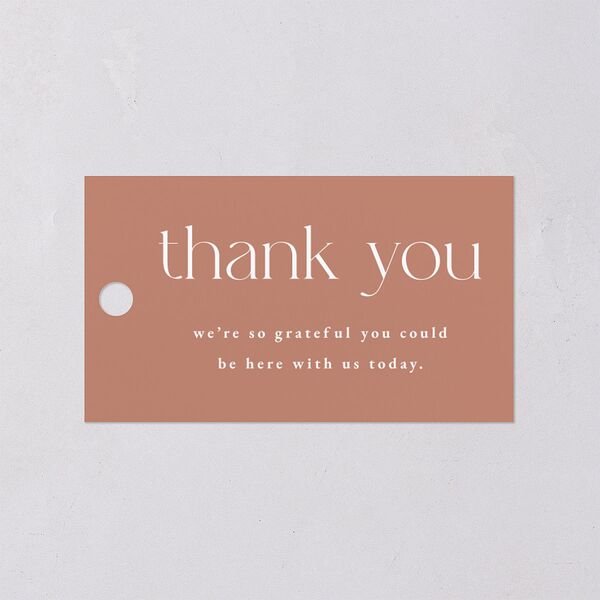 This favor gift tag presents the words "thank you" and your heartfelt message in a modern, elegant font. Your initials appear in script-style typography on the back, and your wedding date is also displayed.