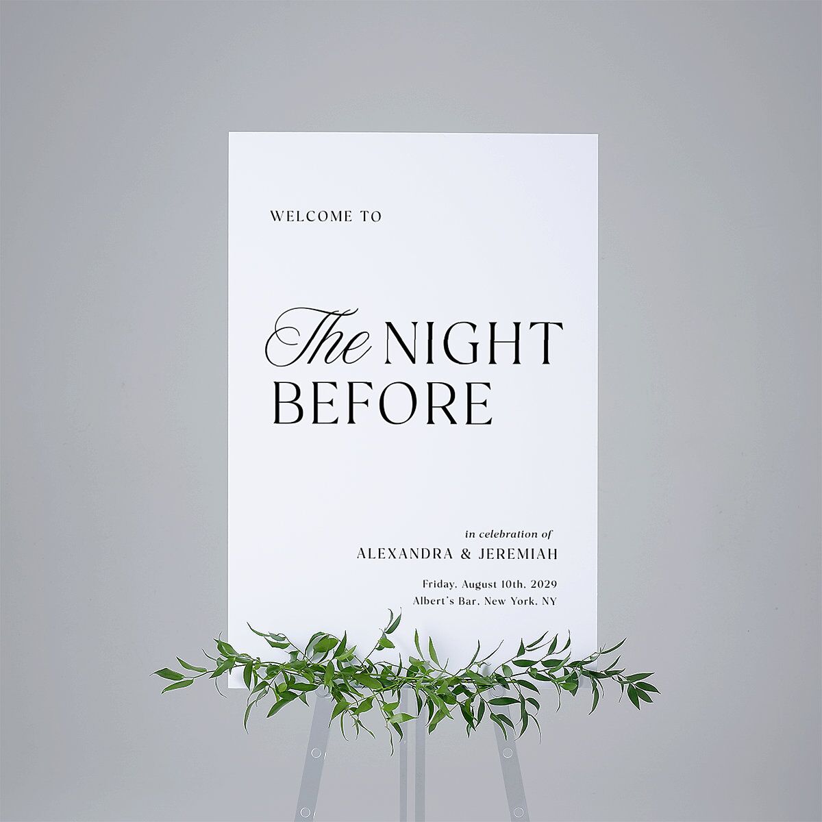 Simple yet luxurious, these welcome signs are thoughtfully designed for your night-before festivities. Perfect for setting the tone ahead of the big day, each sign highlights the phrase "The Night Before" in a chic blend of serif and cursive typography.
