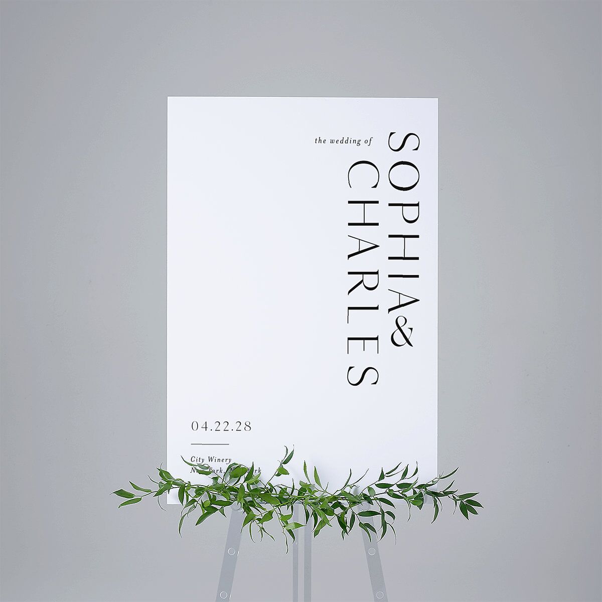 In harmony with the other pieces in this paper suite, these welcome signs feature a classic serif typeface with a playful yet balanced orientation. Your names are prominently aligned to the right in large serif lettering, while your wedding date and location appear below on the left, creating a stylish contrast that draws the eye.