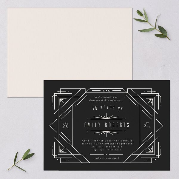 An Art Deco-inspired frame is intricately woven around your details on the front of these bridal shower invitations. Your information appears in a chic blend of vintage sans-serif font and classic serif type.