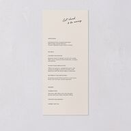 These wedding menus invite your guests to “eat, drink and be merry” in sloping handwritten script. Below this header with the text aligned to the left, the mouthwatering courses are listed in vintage serif lettering.