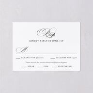 These wedding response cards feature complementary cursive and serif fonts. Your loved ones can indicate their attendance at your celebration and select their entree choice. The back features an ornate monogram of your initials.
