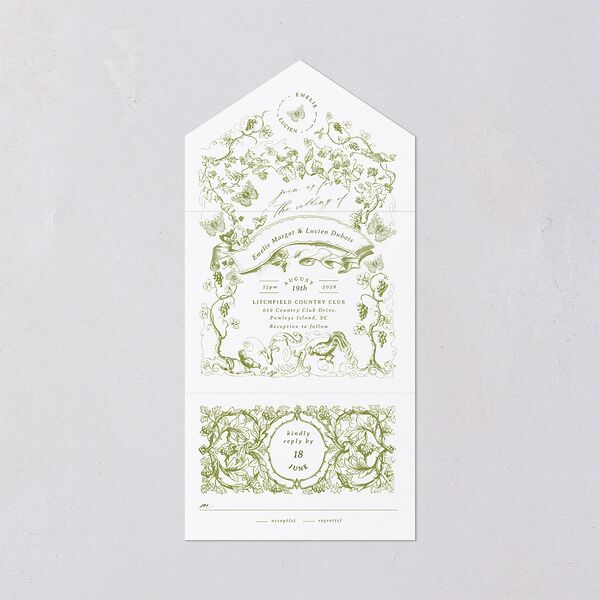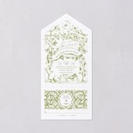 These all-in-one invites feature a nostalgic pastoral pattern with birds and branches surrounding a banner with your names.