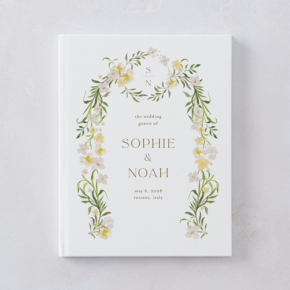 Give your guests a chance to write a sweet message on the day of your celebration. Your wedding guest book showcases a smooth backdrop with your signature, names, date, and location in easy-to-read fonts.