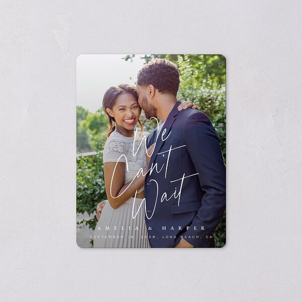 Show your excitement to celebrate when you and your partner can say ""you are mine"" with these exquisite save the date magnets. Your chosen portrait is complemented by a stylish script font that expresses “We can’t wait.”