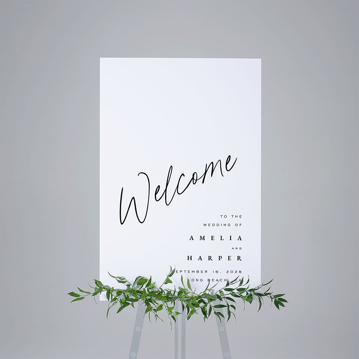 A heartfelt message welcoming guests appears in a flowing script at a slightly angled tilt on these elegant welcome signs. Your details, including names, wedding date, and event location are neatly arranged along the bottom right-hand corner of the design. A solid background provides a clean backdrop that keeps the focus on the typography and personalized details.